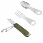 Kompaktowy niezbędnik hiszpańskiej firmy Joker, znanej głównie z produkcji doskonałych noży myśliwskich. Wykonany w całości z wytrzymałej stali nierdzewnej, solidny i prosty w obsłudze. Nóż wraz z łyżką oraz widelec znajdują się w oddzielnych modułach (łączonych za pomocą dwóch mosiężnych rygli) i mogą być wykorzystywane indywidualnie.