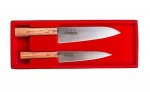 - Dwa noże: Chef z ostrzem 18 cm i Santoku z ostrzem 16,5 cm – każdy do trochę innych zadań.