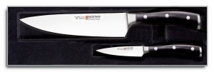 Victorinox i Wüsthof oferują różne linie — od podstawowych zestawów po bardziej rozbudowane komplety z blokiem. Często klienci wybierają Victornox do codziennego krojenia, a Wüsthof przy bardziej wymagających pracach kuchennych (czasem bywa różnica w ostrości).